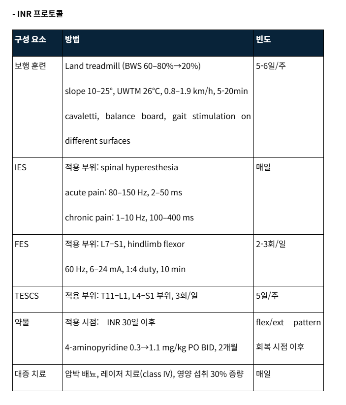 INR์ ๋ฌผ๋ฆฌ ์ ๊ธฐโข์ฝ๋ฌผ ์๋ฒ์ด ํตํฉ๋ ๋ณตํฉ ์ฌํ ์ ๊ทผ์ผ๋ก, ์์ ํ ์ ๊ฒฝ ๊ฐ์์ฑ์ ์ต๋ํ ์๊ทนํ์ฌ ๊ธฐ๋ฅ์ ๋ณดํ(functional ambulation)์ ํ๋ณต์ํฌ ์ ์๋ ํจ๊ณผ์ ๋ฐฉ๋ฒ์