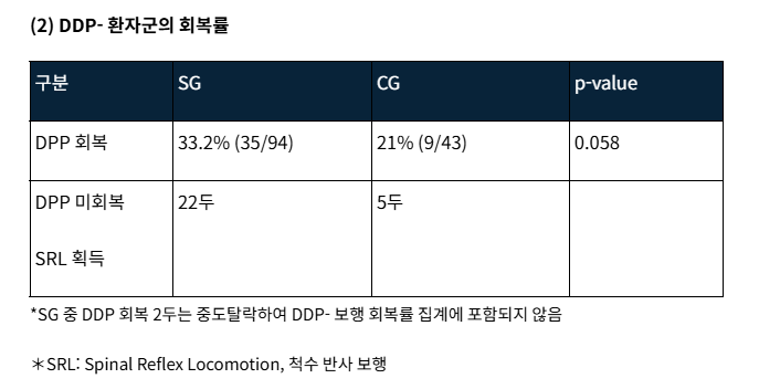 ์ด ๊ฒฝ๊ณผํ ๋ง์ฑ๊ธฐ DPP- ํ์์์๋ spinal reflex locomotion' ์ ๋ ์ค์ฌ์ ์ฌํ ์ ๋ต์ผ๋ก ํ์ฅ ๊ฐ๋ฅ์ฑ ์์ผ๋ฉฐ, ์ด์ ๋ํ ์ถ๊ฐ ์ฐ๊ตฌ๊ฐ ํ์ํฉ๋๋ค.