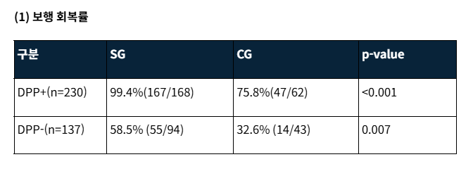 ์ฒ์์์(ํนํ IVDE) ํ ๋ณดํ ํ๋ณต์ ์ํ ์์ธก์ด ์ด๋ ค์ฐ๋ฉฐ, ์์ ์ดํ์๋ DPPโ ํ์์ ๊ธฐ๋ฅ ํ๋ณต๋ฅ ์ ๋ฎ์ ํธ์