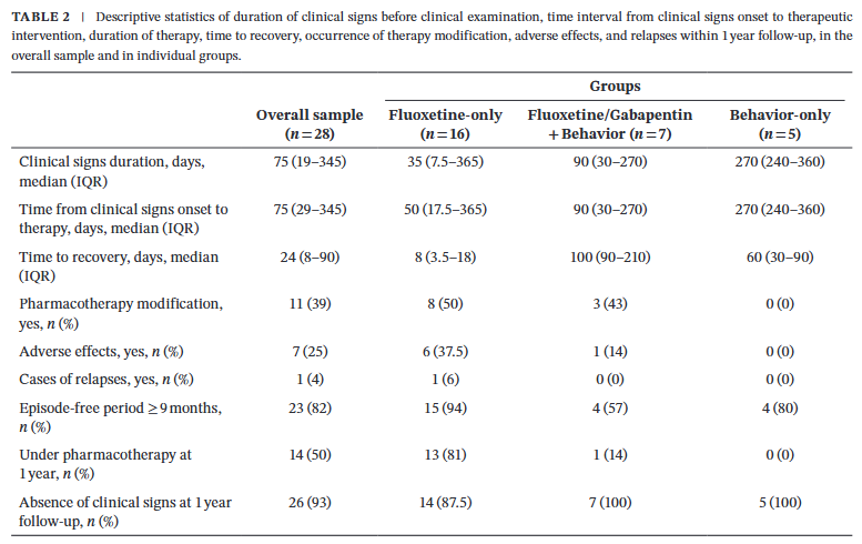 ๊ตฐ์ fluoxetine์ 1mg/kg EOD ๋๋ SID๋ก ์์๋์๊ณ , ์ผ๋ถ ์ฉ๋์ด ๋ถ์กฑํ ํ์์์๋ 2mg/kg/day์์ 3mg/kg/day๋ก ์ฆ๋ํ์์ต๋๋ค. ๋ถ์์ฉ์ 6๋ง๋ฆฌ(37.5%)์์ ์์๋ถ์ง์ด ํ์ธ๋์์ผ๋ฉฐ ๊ทธ ์ธ 1 ์ผ์ด์ค์์ ๊ตฌํ ๋ฐ ์ค์ฌ๊ฐ ์ฐ๊ด๋์์ต๋๋ค. 1๋