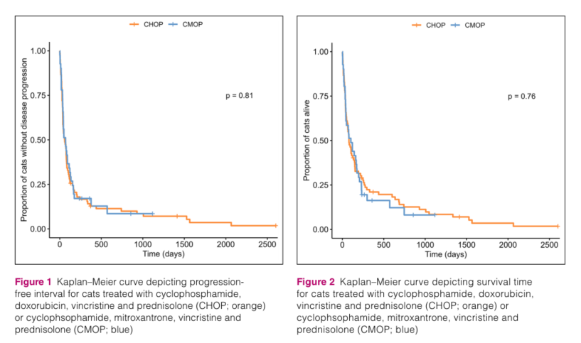 Comparison of outcomes in feline intermediate- to large-cell lymphoma treated with CMOP (cyclophosphamide, mitoxantrone, vincristine and prednisolone) instead of CHOP (cyclophosphamide, doxorubicin, vincristine and prednisolone)